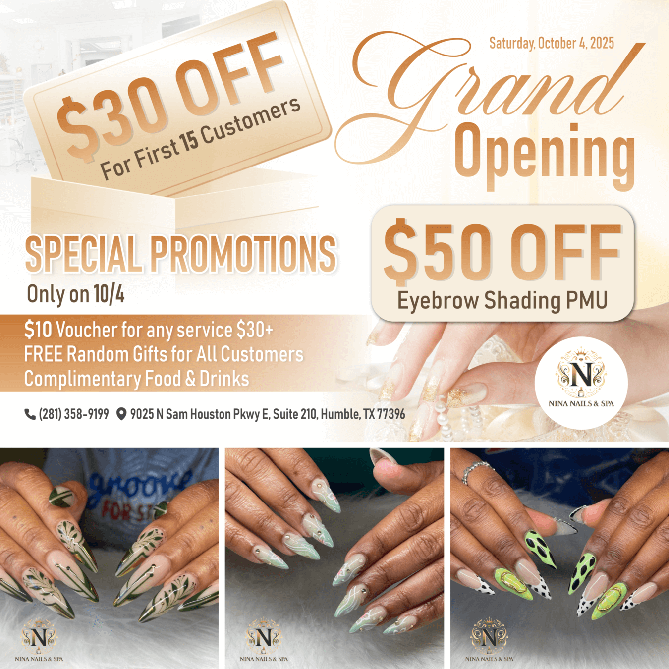 Timeless beauty begins with gentle care, ensuring that your nails remain healthy and elegant. Treat yourself to a relaxing and rejuvenating experience with a natural touch in Humble, TX. Nina Nails & Spa is a nail salon địa chỉ 9025 N Sam Houston Pkwy E, Humble, TX 77396, offering exceptional nail care in a modern and relaxing space.